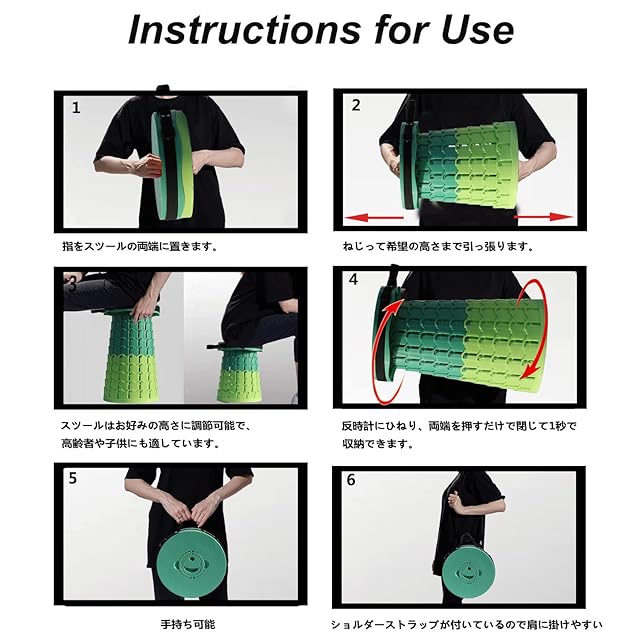 【使い操作簡単】スツール両端の穴に指を入れ、ひねりながら伸ばし、好きな高度に引いて回転して固定します。収納は逆方向に少しひねりを入れながらスツールの両端を押すだけの一瞬で収納が可能です。コンパクトに折りたためるので、収納にも場所を取りません。いつでもどこでも簡単に使える折りたたみ椅子で、室内で使用しても違和感はありません。