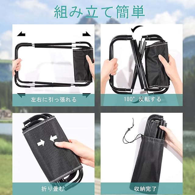 組み立て簡単:おりたたみ椅子がシンプルな折りたたみ式フレームで、収納袋から取り出して広げることで、椅子本体を数秒で簡単に広げることができます。コンパクトに収納でき、トートバッグもついているので持ち運びにも便利です。