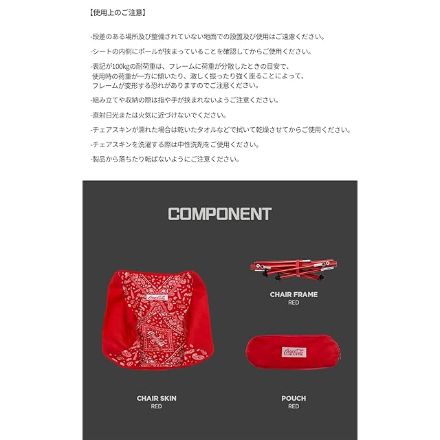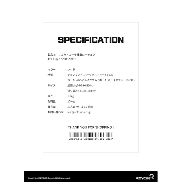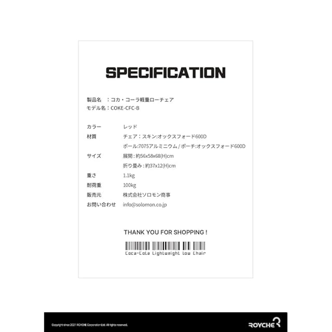 ●製品名:コカ・コーラ 軽量ローチェア_COCA-COLA CAMPING LOW CHAIR<br> ●モデル名 :COKE-CFC-B<br> ●カラー :RED<br> ●材質:チェアスキン:オックスフォード 600D / フレーム:7075アルミニウム / ポーチ:オックスフォード 600D<br> ●サイズ :展開:約56×58×68(H)cm / 折り畳み :約37×12(H)cm / フォールディングチェアポーチ(S) :約370×120×90(mm)<br> ●重量 :約1.10kg<br> ●耐荷重 :約100kg<br> ●製造国 :中国<br> ●製造元 :株式会社 ロイチェ<br> ●販売元 :株式会社 ソロモン商事<br> ●お問い合わせ:[email protected]<br> ●発売日: 2022/12/02 <br><br> <b>※不良品の基準について</b><br> チェアのフレーム(ポール)の部分は生産過程でスクラッチ、傷など生じることがあり、 これは製品工程時に自然に生じる跡であり不良品ではありません。<br> 裁縫した部分が白色に見えることがありますがこちらは不良ではありません。<br> ポーチのファスナーは触れる部分がすれるとペイントが剥がれることがあります。 チェアの脚の保護キャップは付属品として簡単に交換できます。<br> 不良品発見時は保護キャップのみ別途交換させていただきます。<br><br> <b>※パッケージについて留意点 </b> <br> 当店商品は海外工場で制作しており、商品に問題はありませんが、多少の傷や汚れがある場合がございます。<br> 恐れ入りますが、商品自体には問題がございませんので交換対象とはなりませんのでご了承お願いいたします。<br> また、発送時に衝撃緩衝材などで最大限傷などつかないように商品を梱包しておりますので、配送中にできたパッケージの傷などにつきましても同様、商品自体には問題ございませんので交換対象とはなりませんのでご了承お願いいたします。 <br> 商品が不良品である場合には、返品対応期間内であればご対応致しますので、<br> お手数おかけいたしますがお問い合わせフォームにてご連絡をお願い致します。<br><br> ※ご覧になる環境(PCのモニターやスマートフォンの画面等)の影響により、色合いが異なって見える場合がございます。 上記内容での返品・交換につきましては、お客様都合での返品・交換対応となりますのでご了承お願い致します。 万が一、気懸りな点がございましたら購入前にお問い合わせください。<br><br> <b> ※※※本製品はCoca-Colaとの正式ライセンス契約により(株)ROYCHEで製作、日本販売は(株)ソロモン商事が販売するものでありCoca-Colaの許可がない限り、いかなる場合も無断で複製および販売することを禁じます。<br><br> ※※注意事項※※<br> 商品パッケージの販売名義が(株)ソロモン商事ではない場合や海外購入商品の場合は弊社ではお客様サポートなど保証が出来かねます。 ご注意下さい。</b> <br><br><br>