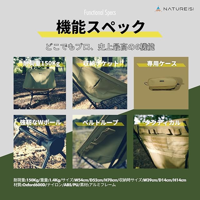 NATURE(S) キャンプ チェア タクティカル アーミーグリーンコンパクトチェア サイドポケット Oxford600D生地 アルミフレーム 耐荷重150kg 釣り デザイナーズ ZA