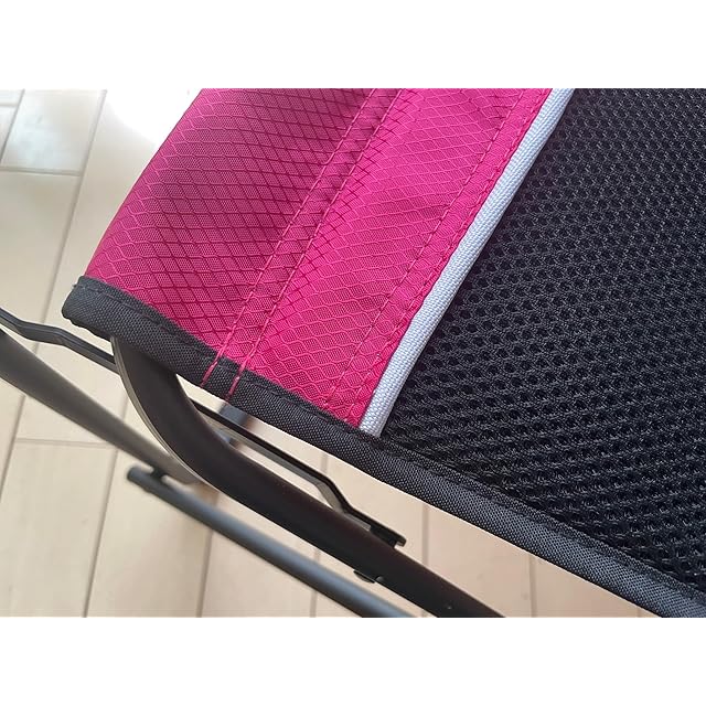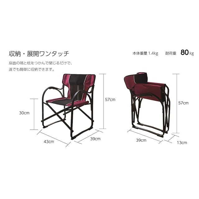 使用時:幅43 x 奥行39 x 高さ57cm 収納時:幅13 x 奥行39 x 高さ57cm 重 さ:1.4kg 耐荷重:80kg 素 材:フレーム /アルミ合金、座面/ポリエステルメッシュ(黒色)、リップストップナイロン(ピンク色)