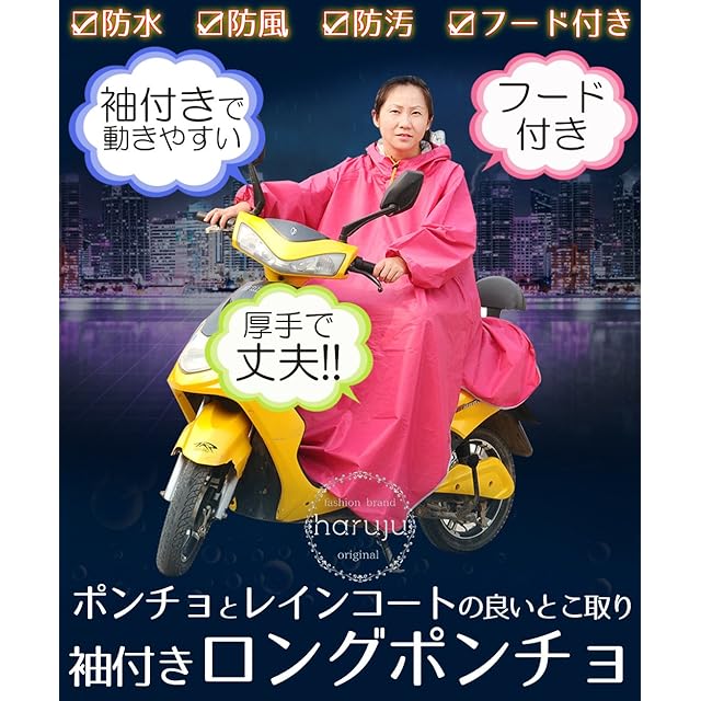 【ポンチョだけど袖がある!ポンチョとレインコートの良いとこ取りのロングポンチョ】①袖付きだからハンドル操作がしやすいです。②ポンチョの上でも下でもリュックを背負うことが可能です。③走行中に舞い上がりにくいです。舞い上がりそうになっても袖があると多少の押さえになります。