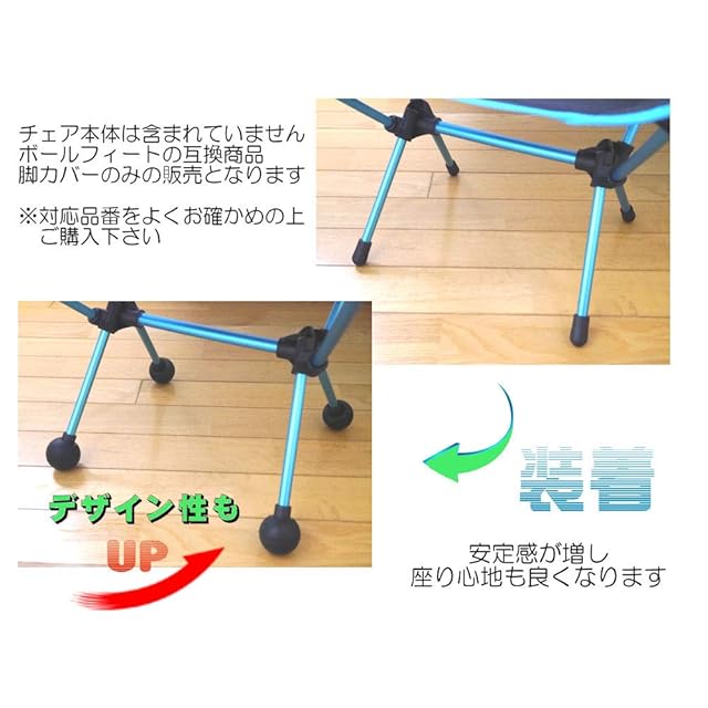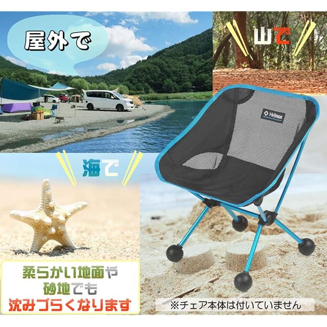 長野アウトドアスタイルが作ったヘリノックスチェアシリーズ専用のボールフィートの互換商品です。 チェアの脚に取り付け、砂地などの柔らかい地面で脚を沈み込みにくくします。 また、フローリングの床やカーペットが傷つくのを防ぎ、使用中に椅子が滑るなど、滑り止めの効果もあります。