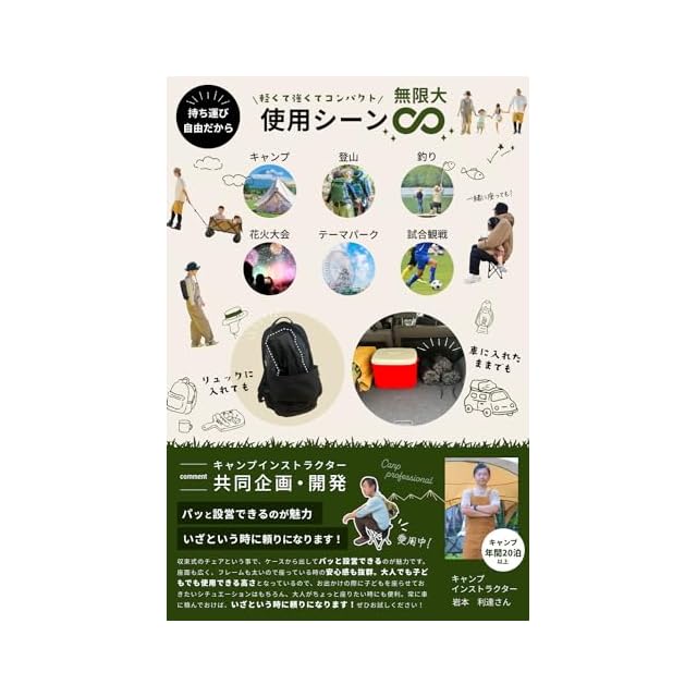 【超コンパクト使用シーン無限大】イス脚部の特殊ヒンジにより、使用後はコンパクトに折畳が可能です。また、専用のオックスフォード生地の収納袋にしまうことで、どこへでもすぐに持ち運びが可能です。キャンプ・BBQ・釣り・花火大会・テーマパーク待ち時間・大阪万博・ピクニック・花見・子供の試合観戦など様々なシーンでご使用いただけ、車に一台置いておけばどこでも安心なアウトドアアイテムです。