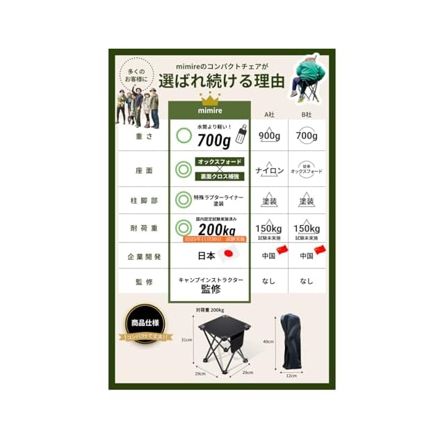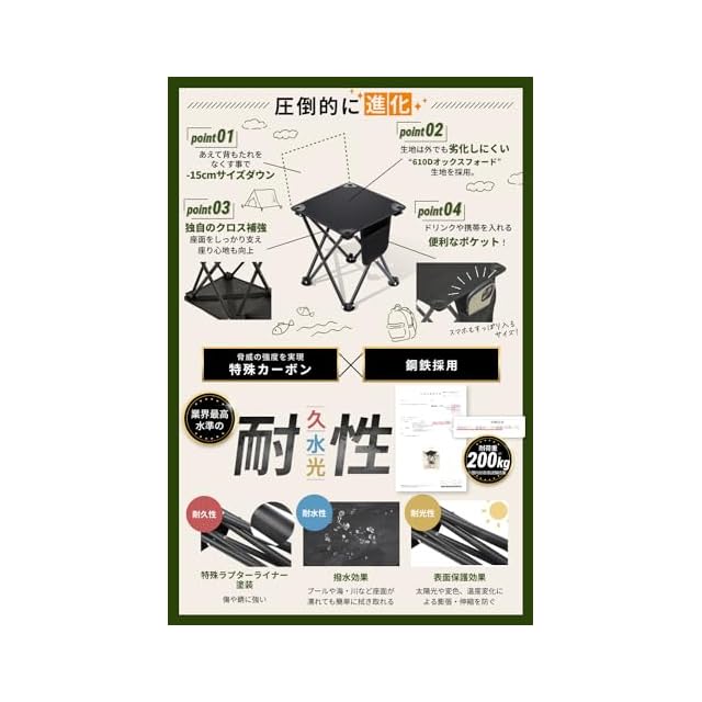 【既存商品を大幅改善!業界最高水準の耐久性】脚部のパイプはラプターライナー塗装という特殊塗装を行うことで、表面の保護をより強力に行い、耐久性・耐水性・耐光性を大幅に向上しております。また座面には610Dオックスフォード生地を採用し、撥水性・耐摩擦性・通気性を向上し、より長く安心してお使いいただけます。座面裏側にはクロスで補強を追加し、座った際に沈み込みづらく、より強靭な座面へと進化させました。この軽さとコンパクトさで国内認定試験で耐荷重は驚きの200kg!大人の膝の上に子供が乗っても安心してご使用いただけます。