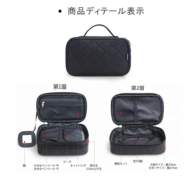 【収納】2段階で大容量:1階:ファスナーポケット1個、メッシュポケット1個、高さ1.5cm 2階:ストレッチネット、空きフロア、5cm高さの小さなサイズ、7cm高さの大きなサイズ。ジッパーは使いやすい ダブルジッパー付き。旅行時や出張時などに充電ケーブルやアダプタ、マウスなどをまとめて収納できる小物収納ポーチです。