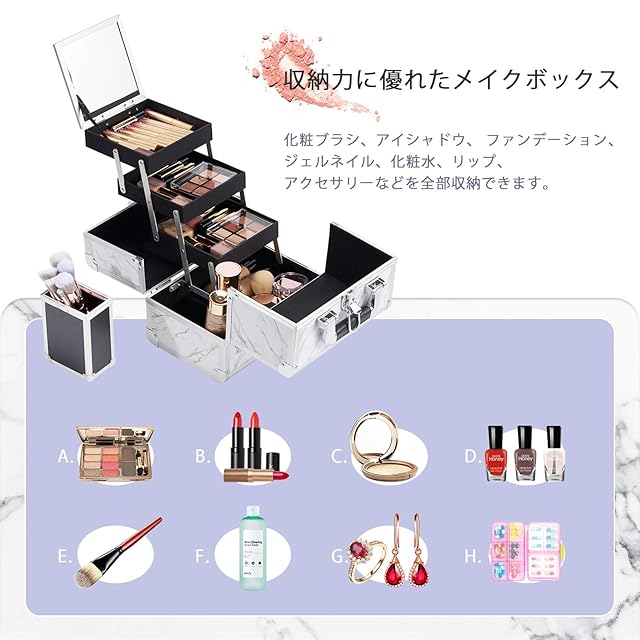 【大容量】三段式のスライドトレイとワイドな底部は抜群な収納力を持っております、化粧水・乳液・下地・ファンデ・ルースパウダー・チーク・ブラシ、ネイルなどを普段に使っているものをすべて入れます。メイクブラシホルダーが附属され、コスメ、メイクブラシ、化粧品などの収納に適しています。