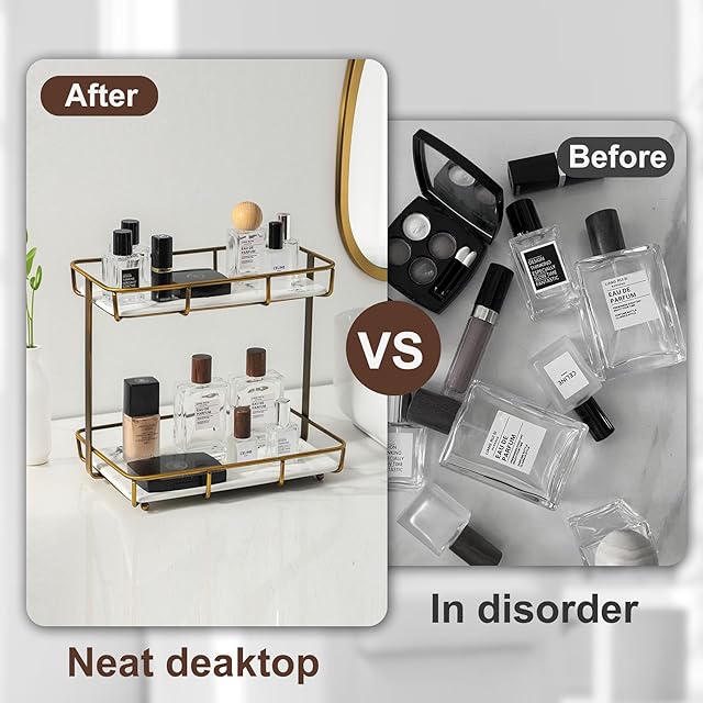 バスルームオーガナイザー カウンタートップ 香水オーガナイザー メイクアップオーガナイザー 化粧品ストレージ ディスプレイラック バニティトレイ ドレッサー ステンレススチール ゴールドシェルフ 白大理石 セラミックトレイ