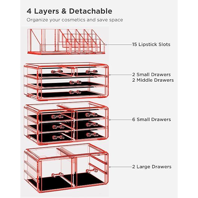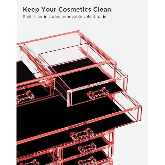 防塵性と耐久性: 高品質のアクリル素材で作られており、防塵だけでなく、頑丈で耐久性があります。 透明な引き出しにより、ほこりや汚れから保護しながら、化粧品を簡単に見てアクセスできます。