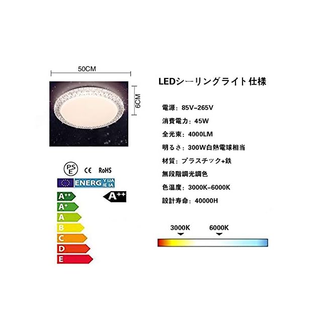 【高い演色性】演色性が高いLEDシーリングライト、自然光に近いとされていますから料理の色や人の肌等、美しく自然に見えます。設計寿命:40,000時間;色温度:3000K-6500K;器具光束:4000lm;消費電圧:AC85-265V ;サイズ:直径500mm*高さ60mm;定格消費電力:45W(100%点灯時)、20W(60%点灯時)、10W(30%点灯時)、0.5W(常夜灯点灯時)。