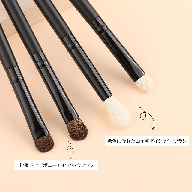 【天然毛&高級タクロンを使用】2本ポニーヘア+2本ヤギ毛アイシャドウブラシ付き、ヤギ毛とポニーの毛は柔らかくて弾力性に富んでおり、発色に優れていて繊細な目元を傷つけないです。 ボリュームたっぷりの穂先で肌を艶っぽく均一に仕上げることができます。メイク初心者の方からメイクアップアーティストまで好まれています。