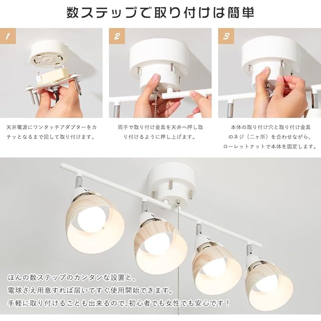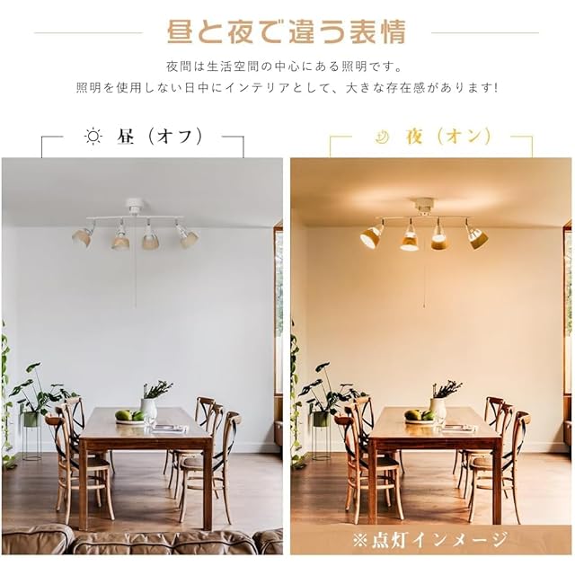 【点灯切り替え】:プルスイッチを付いてのデザインです、プルスイッチで明かりは4灯→2灯(内側)→2灯(外側)→消灯の順番でON/OFF / 点灯切替できます。