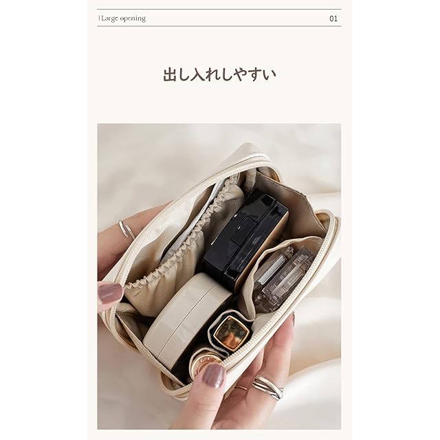 [便利なメイクポーチ】口が大きく開くので、化粧品やブラシなどの小物の出し入れがしやすく、中に何が入っているか見つけやすい。しかもたくさん入れられます。中はシンプルなデザインで機能性も抜群です。