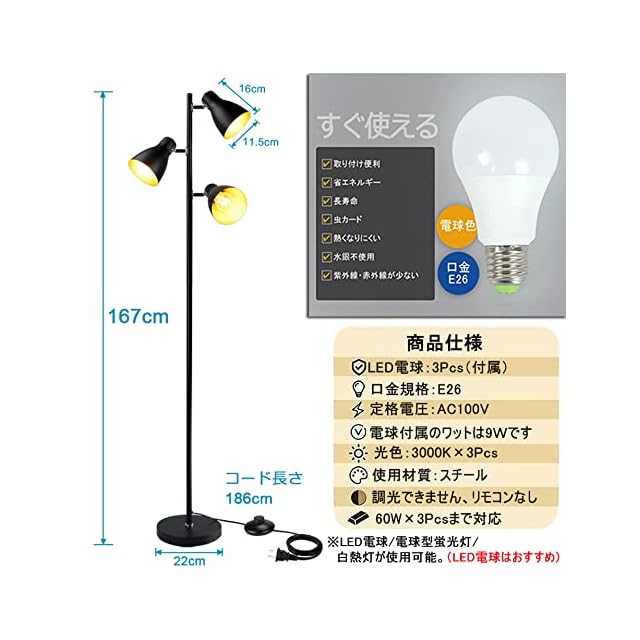 商品詳細:サイズ本体横22cm x高さ167 cm、材質:スチール、コード長さ:186cm、スイッチタイプ:フットスイッチ、 使用電球(LED電球付き):口金E26のLED電球/電球型蛍光灯/白熱灯が使用可能。(最大消費電力が60Wで、それ以上の電球お控えください。)