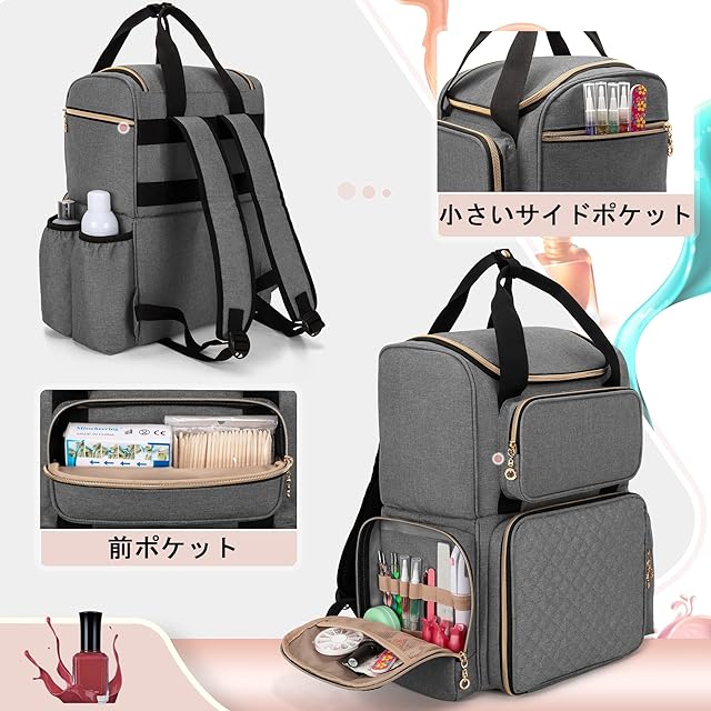 ネイル道具の保管:内ポケット付きのサイドポケットにはブラシとドットツールなどを収納することができます。2つのサイドホルダーにはマニキュアリムーバーなどの大きなボトルを立てて保管できます。前ポケットにはほかのネイル用品を収納することができます。