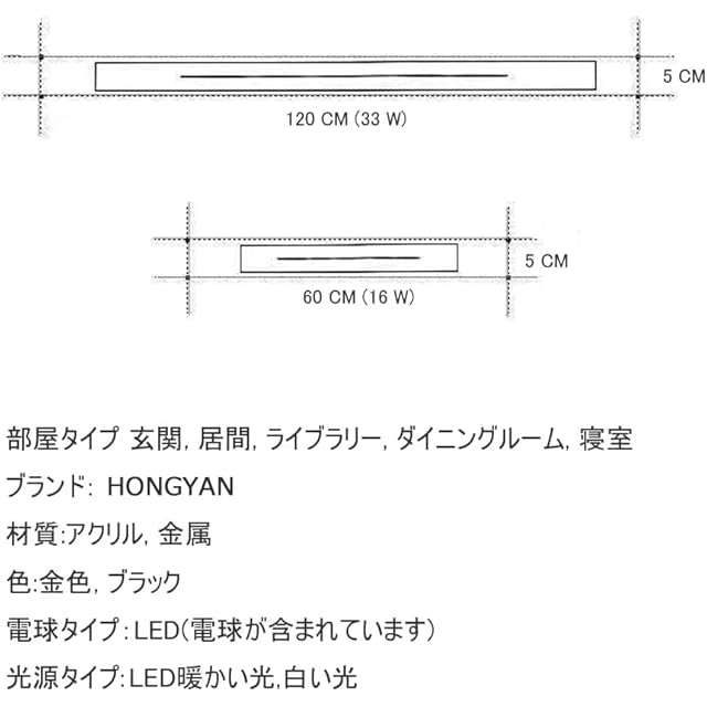 【製品仕様】サイズ:60*5*5CM、80*5*5CM、100*5*5CM、120*5*5CM。材質:アクリル, 金属。色:金色, ブラック 。電球タイプ:LED(電球が含まれています)。光源タイプ: 暖かい光, 白い光。