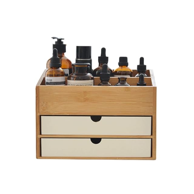 木製がナチュラルでお洒落なジなんでも収納ボックス。 コンパクトなのに大容量◎ マニキュア、マスカラ、リップ、グロス、アイライナーを立てて収納することができます。 下段には2段の引き出しがあり、アクセサリーや腕時計、その他コスメ用の小物などを収納することが可能です ☆