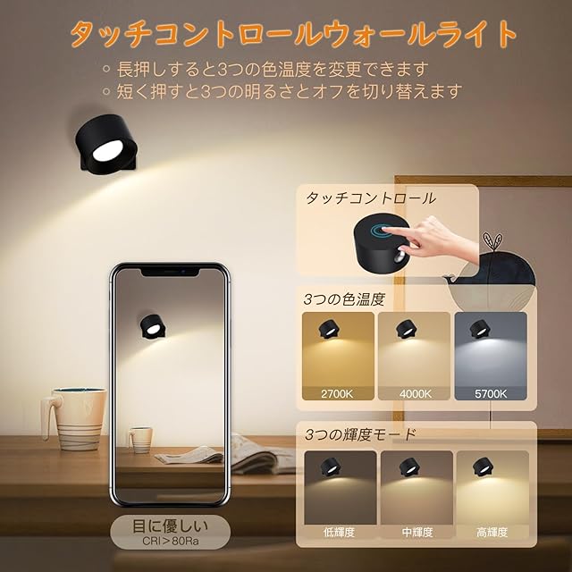 【3つの色温度 & 3段階の明るさ】このLED ブラケットライトは、3つの色温度(電球色:2700K、昼白色:4000K、昼光色:5700K)に切り替え可能。コンピューター作業にはコールドライト、読書にはナチュラルライト、就寝時やリラックスタイムにはウォームライト!各色温度は3段階の明るさ(高-中-低)です。小型磁気ウォールライトに少し触れて、あなたの日常生活に最も適した光を選んでください!