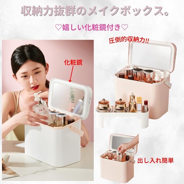 ORIJIRI メイクボックス 鏡付き コスメボックス 大容量 持ち運び 化粧品収納 プロ仕様 大きめ かわいい (ホワイト)
