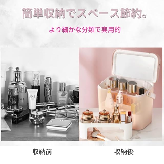 収納力抜群のメイクボックスです。散らかりがちなメイク用品をまとめて整理できるので机上のスペースを確保できます。インテリアの邪魔をしないシンプルなデザインで、コンパクトなので持ち運びもラクラクです。好きな場所で気分を変えてメイクを楽しんで下さい。