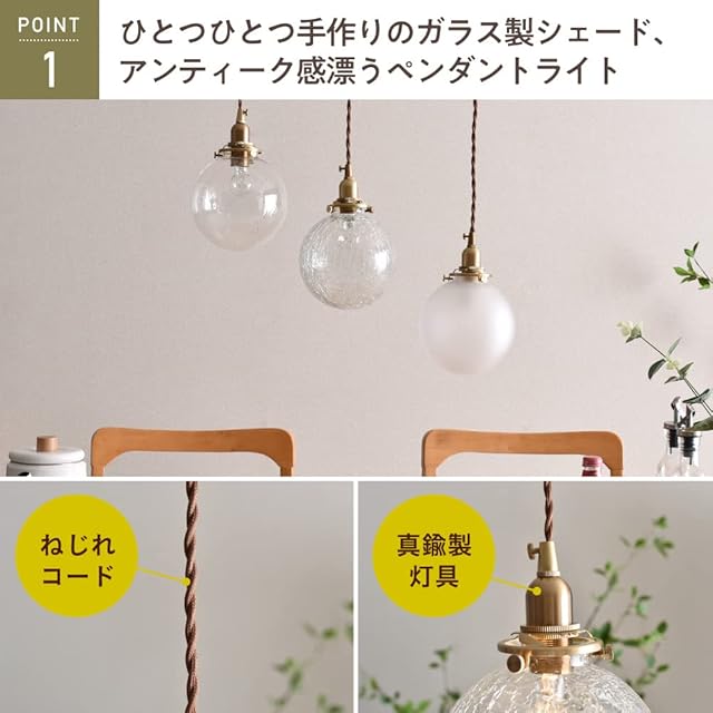 Point 1.【ひとつひとつ手作りのガラス製シェード、アンティーク感漂うペンダントライト】クラシカルな佇まいはアンティーク・ヴィンテージ・ナチュラル・カフェ風等さまざまなスタイルの空間にマッチします。 ガラスシェードはハンドメイドの吹きガラスで一つ一つ職人さんが丁寧に手作りしたものです。形や大きさに微妙な個体差があり、ハンドメイドならではのテイストをお楽しみいただけます。(形状には多少の誤差がございますが、その手作り感をお楽しみくださる方におすすめします)