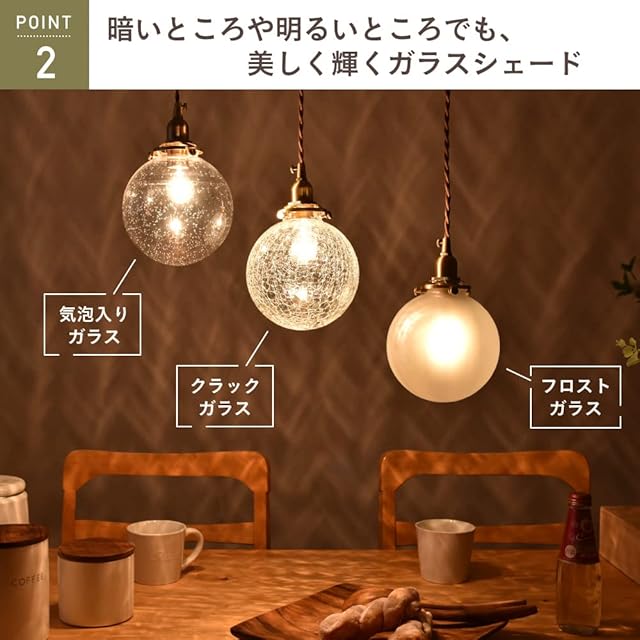 Point 3.【暗いところや明るいところでも、美しく輝くガラスシェード】本商品は、気泡入りガラス・クラックガラス・フロストガラスの3つのタイプからお選びいただけます。『気泡入りガラス』は、透明な分、シェード自体の軽い感じがより一層際立ち、上品な雰囲気になります。『フロストガラス』は、透明なガラスを被せるように色ガラスを重ねて作ったガラスです。ガラス全体に優しい光が広がるので、空間を優しく照らしてくれます。『クラックガラス』は、透明のガラスに美しいひび模様が入っており、光が灯るとひび割れ模様に光が乱反射してキラキラと輝き、個性的な雰囲気を演出してくれます。