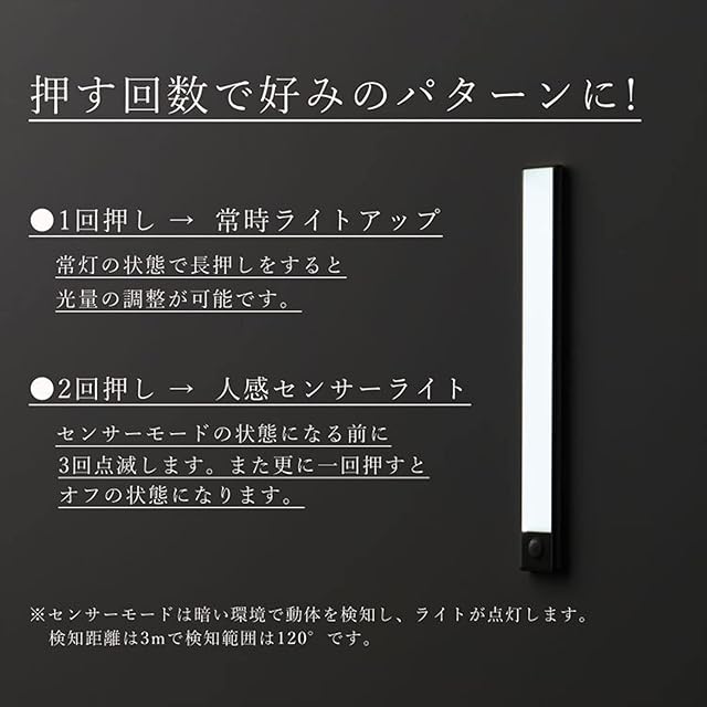 【3つのスマートモード、簡単な切り替え】人感センサーモード(AUTO)、常時点灯モード(ON)と消灯モード(OFF)。①人感センサーモード:暗い環境(廊下、車庫、階段、玄関...)の中で動体を感知して点灯し、節電し、省エネ、電池の使用時間を延長します。② 常時点灯モード:停電や緊急の際は、懐中電灯として使用ができます。③消灯モード:センサーライトを長期間使用しない場合は、オフモードに調整できます。必要に応じて照明モードを選択できます。