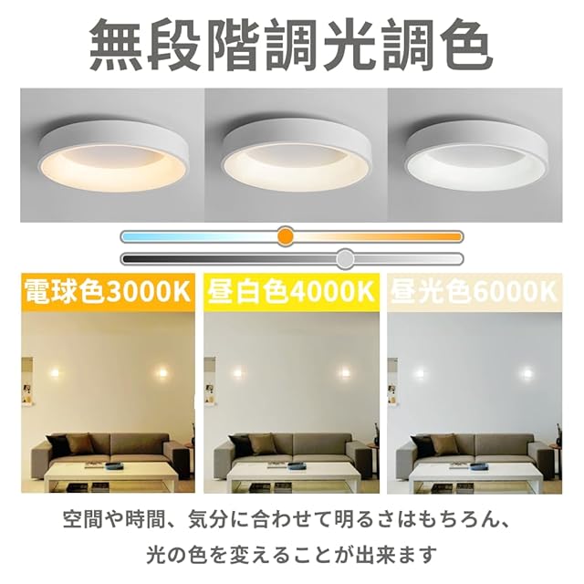 【無段階調光&調色調光】 シーリングライトは電球色、昼白色、昼光色う三種類色があり、また、暖かい黄色2700Kから昼光色7000Kまで自由調整出来、好みに合わせて照明の雰囲気を選びます。LEDシーリングライトは高品質なLEDチップを採用し、隅々まで均一に配置しており、照明効果が均一、より明るいです,演色性はすべてRa85以上を実現します。自然の太陽光に近い波長を実現し、目に負担をかけない高演色性,部屋全体を美しく照らすことができます。0~100%の範囲で輝度・明るさを無段階に調整可能ます。