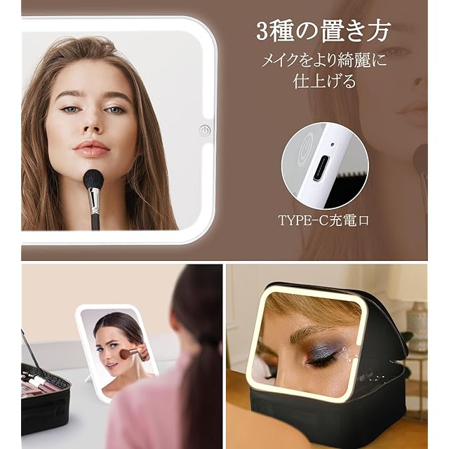 「LEDライト鏡付き」 昼白色・温白色・電球色の3色に切り替えられるLEDライト付き鏡が内蔵され、ボタンを長押しすれば無段階調光できます。USB充電式で在宅、オフィス、車内、外出時などの時にも簡単に充電できます。マジックテープ式固定で、鏡をメイクボックスから外すことは可能です。