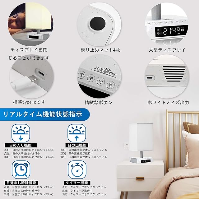 【光で心地よく目覚める】 普通の目覚ましとは異なり、日の出モードで自然に明るくなる光が体を優しく目覚めさせます。大きなディスプレイで現地時間や機能状態を一目で確認できます。