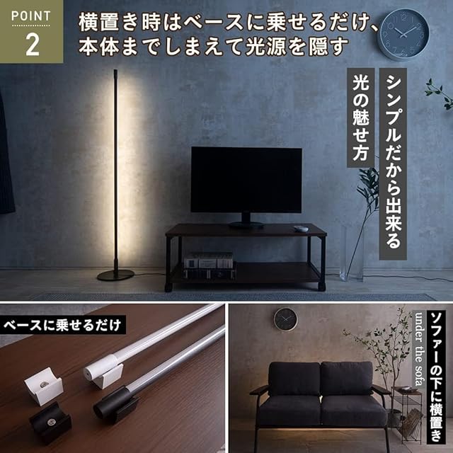 Point 2.【横置き時はベースに乗せるだけ、本体までしまえて光源を隠す】 Liioは縦置きと横置きを自由に変えることができます。縦置き時は本体を回して台座に固定し、横置き時は付属のベースに乗せるだけと、非常に簡単です! 横にして暗い廊下の足元照明として使ったり、ソファの下に横置きで置くだけで、高級感が一層アップします。 マグネット式のベースに乗せる角度を変えるといろんな方向180度に光を出すので、本体の向きを変えるだけで簡単に光源を隠すことができます。家具の背後などに光源を仕込むことで、照明器具の存在を隠し、反射する光だけを見せる演出はよりおしゃれ度が高まります。Point 3.【縦置き時はミニマリズムを極めたデザインと、間接照明の役割を十分に果たす存在感】 洗練された極めてシンプルなデザインから、本体が見えても広々とした空間が楽しめます。縦にする場合は台座部分には20cm四方の隙間があればお使い頂けます。細長いボディは、シンプルモダンテイストのお部屋のインテリアとして最適で、玄関照明として、寝室ランプとして照明の役割を果たしながら、消灯時にはインテリアと一体化してくれます。
