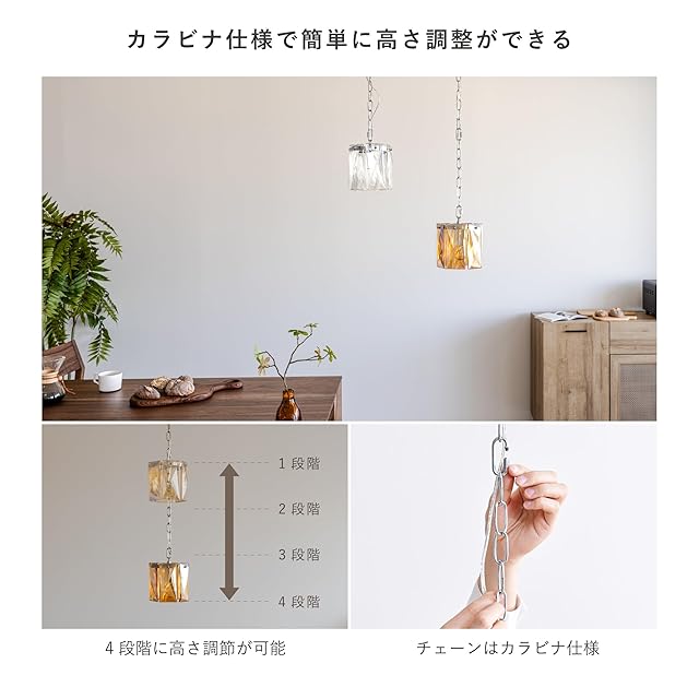 【カラビナ仕様で簡単に高さ調整ができる】コードアジャスターの長さは約85cmで長さ調節が可能。お好みの長さに調節ができるので、設置後も気分に合わせて簡単にコードの長さ調節ができます。また、余分なコードはシーリングカバー内に収まるので設置後の見た目も気にならずキレイに取り付けが可能。チェーンの長さは4つのカラビナで調節ができます。