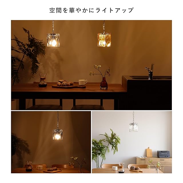【昼も夜もお部屋に溶け込むアクセントに】昼の消灯時は自然光で美しく輝く透明のガラス製シェードのデザインがお部屋を彩り、夜の点灯時はガラスで反射された光を拡散し、温かく包み込むような雰囲気を作り出します。昼も夜も、吊るすだけで美しく華やかなペンダントライトです。 【使用する電球で変わる陰影】使用する電球を変えることで、お部屋のイメージがガラリと変化し、自分好みの照明の明るさをお楽しみいただけます。一般的に白熱電球を使用される場合は影がくっきりと映り、LED電球など光が柔らかい場合は影もぼやけて映ります。 【白熱電球】暖かみのある光が一番の特徴で、やんわりと明るく照らすことができます。/【LED電球】省エネ性・機能性がポイントで長く使い続けたい方におすすめ。