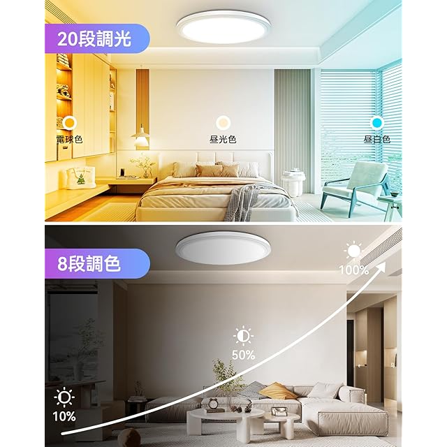 【10段階調光&7段階調色&5種類の色温度ワンタッチ変換】 電球色/昼白色/昼光色/常夜灯/常夜灯+昼白色+昼光色など、自由に変換できます。現在、新しくアップグレードされ、常夜灯と昼白色が同時に点灯するようになり、光がより明るく透き通るようになりました。リビングルーム/キッチン/寝室/書斎など、さまざまなシーンに適しています。