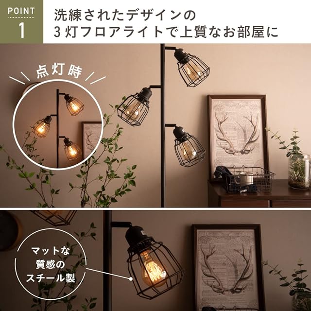 Point 1.【洗練されたデザインの3灯フロアライトで上質なお部屋に】電球を覆う金属格子がランプシェードになっており、マットな質感のスチールで出来た作業灯のようなシェードです。 一般的なスポットライトとは違い対象物を照らすというよりは、光源そのものを楽しむようになっています。 本体はスチール製でマットなメッシュシェードでインテリアのアクセントとしてお使いいただけます。 点灯の際には、メッシュシェードの網目によって光と影が美しく壁に照らし出され、お部屋の雰囲気を一層オシャレに変えてくれます!