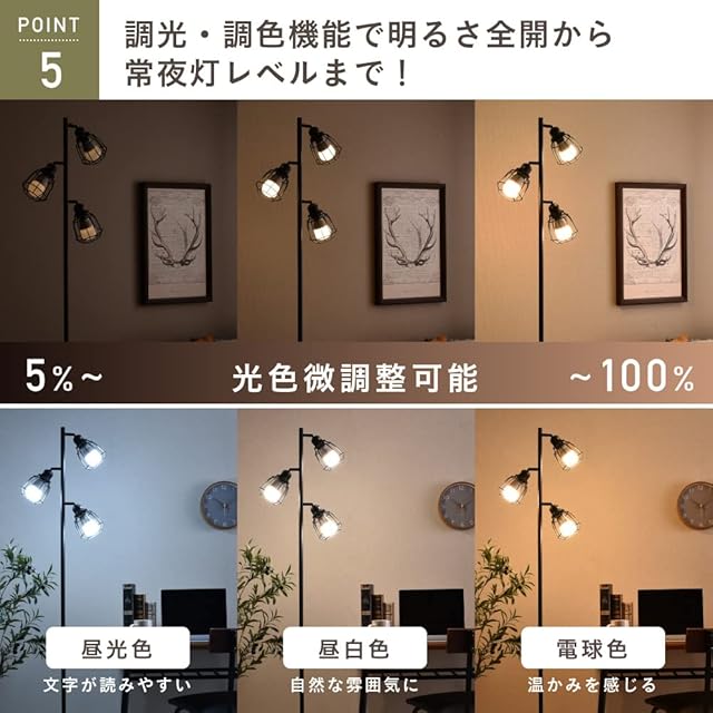 Point 4.【自由度が高いフロアライトだから様々な場所で活躍】3つのシェードが独立して動かせるのでアッパーライト・スポットライト・間接照明としてあらゆる場所に合わせてお使いいただけます。 手で簡単に動かせるので照らす場所を変えてお部屋の模様替え時など役立ちます。また、消灯時もおしゃれなインテリアとして大活躍します。 アッパーライト:天井に向けて広範囲に明かりを照らし柔らかい空間に。 スポットライト:特定の箇所を明かりで照らしムードのある空間に。 間接照明:お部屋のインテリアに馴染むサブ照明として。