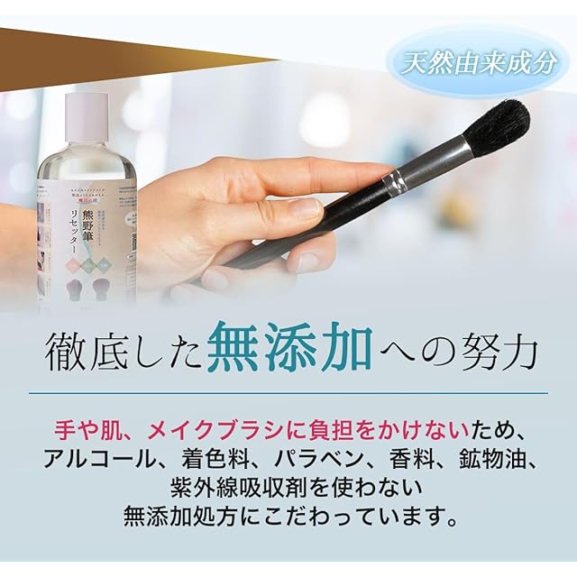 【手でゴシゴシ擦らなくてもよい】指で毛を揉みこみ、さらにゴシゴシこすったりしないと汚れが落ちない!熊野筆リセッターは、浸け置くだけで汚れがみるみる浮いてくる魔法の液です。また、洗浄液専門のメーカーとの共同開発だからできた業界初【自社調べ】のイオン洗浄。イオン洗浄なので、ゴシゴシこすらなくても、菌やメイクの汚れや皮脂も分子レベルで包みこんで引きはがし、熊野筆リセッターに汚れたメイクブラシを付けるだけで自然に汚れが浮いてきます。