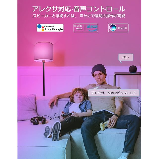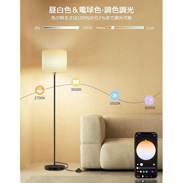 【音声操作】スマートスピーカーと接続すれは、声たけでフロアライトの操作が可能に。ライトのオン/オフのほか、明るさ、色温度、カラーも音声で調節可能。手が離せないとき、ハンズフリーで部屋の照明を音声操作しましょう。