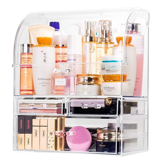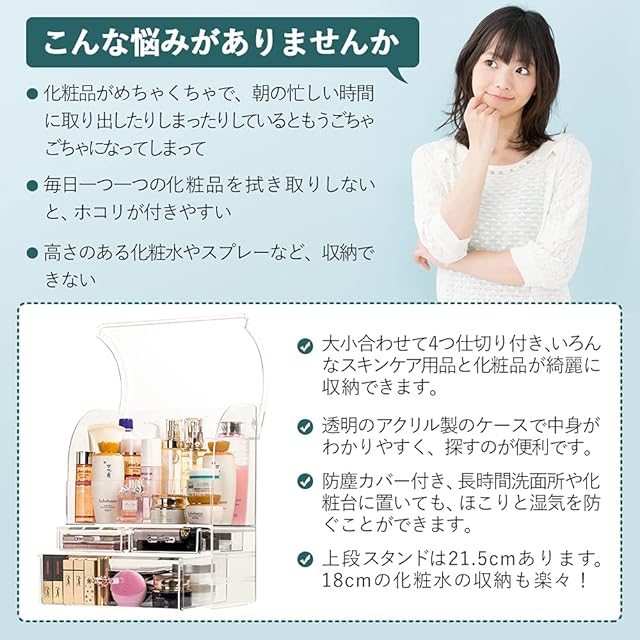 【⭐大容量】:販売元:Carbro;化粧品収納ボックスは三層の連体設計で、組み立てる必要がありません。1つ大きな収納エリア+3つの引き出しがあり、上の階は高さ21cmで、大きなボトルの化粧水、乳液、エッセンスなどが収納できます。