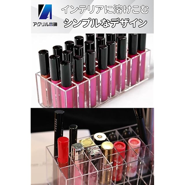【✅アクリルリップスタンド】最大24本の収納が可能です。散らかりやすいリップや口紅、グロス、マニキュアなどをスッキリ収納でき、360度回転するスタンドで収納した口紅をキレイに整理整頓できます。耐久性・機能性にも優れ、収納力抜群のアクリルリップスタンドです。【✅大容量の収納力】卓上サイズのコンパクトなリップスタンド。メイク小物をオシャレに収納できます。透明アクリルケースは置き場所を選ばずどんな場所にも似合います。組み立てが不要で、完成された状態でお届けいたします。【✅水洗い可能。汚れてもお手入れ簡単】耐久性にも優れた高品質のアクリル素材なので、汚れてしまっても簡単に水洗いができます。透明なアクリルケースは部屋、洗面所、リビングルームなど、どんな場所にも馴染みます。機能性にも優れたアクリル製リップスタンドで口紅、リップグロス、マニキュア、クリーム、コスメ類を見た目もお洒落に収納できます。【✅サイズ】210mm × 89mm × 75mm、重量:305g。1マスあたりの収納サイズは25mm × 25mmとなっています。【✅安心の日本ブランド】当アクリル本舗ブランド正規品は30日間返品・返金保証付き。当ブランド以外の商品につきましては、責任は当ストアでは一切負いかねますので、ご購入の場合は十分にご注意ください