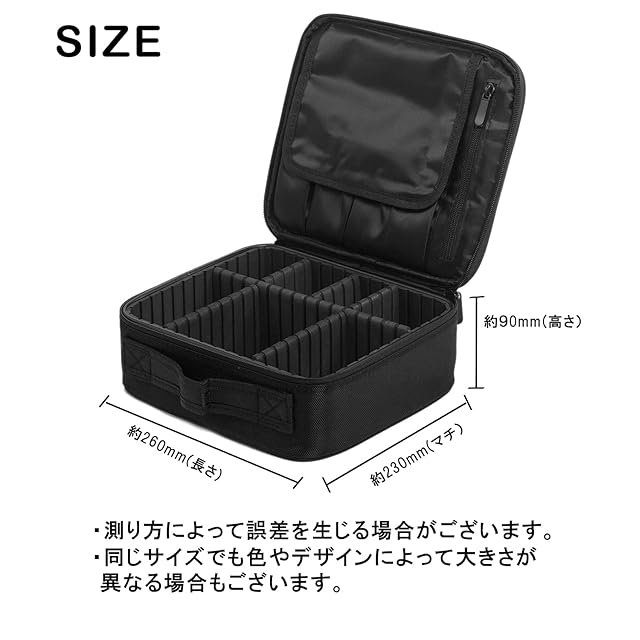 「化粧ボックスサイズ」: 約260(長さ)×90(幅)×230mm(高さ) 本体重さ:620g、持ち運び用のポーチとしても便利に使えます。パッケージ内容:プロ化粧パック、仕切り板*6(長め*1 中*2 小さめ*3)。素材:オックス、ナイロン、ポリエステル、EVA。