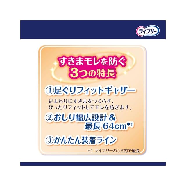 おしりをすっぽり包み込んでスキマをつくらない、幅広形状がしっかりガードし寝返りモレと後ろモレを防ぎます。