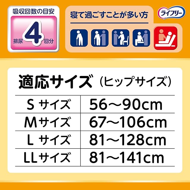 Mサイズ ヒップサイズ67〜106cm 吸収回数の目安※排尿4回分 ※1回の排尿量150mlとして(当社測定方法によるものです)