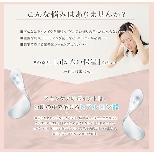 ✅ 【 目元のお悩みに、ふっくらハリのある肌へ 】 ■ 2800本の溶ける針でヒト幹細胞培養液+ヒアルロン酸を肌にしっかりとお届け! ■ 「どんなにアイメイクを頑張っても、思い通りの目もとにならない」「目元・口元が気になる」「重要な約束など、早いケアが必要」「自宅で簡単&気楽にホームケアしたい」 これらのお悩みは「届かない保湿」のせいかもしれません。スキンケアのポイントは、お肌の中で溶けるヒアルロン酸。低分子化されていないヒアルロン酸の場合、ほとんどが表皮にとどまってしまい、肌の奥まで浸透しないと言われています。マイクロニードルにすることによって、 肌の機能を守る大切な潤いを角質層にとどめることができます。
