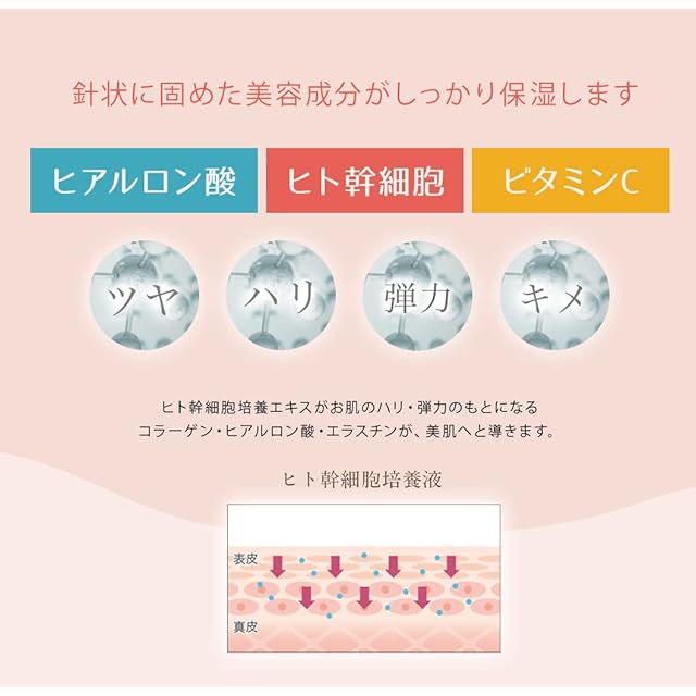 ✅ 【 本来の肌が目を覚ますヒト幹細胞培養液配合 】 ■ ヒト幹細胞培養液エキスとお肌のハリ・弾力のもとになる コラーゲン・ヒアルロン酸・エラスチンが、ふっくらとした 肌へと導きます。 貼って寝ているだけで、 翌朝ハリ感、睡眠時間=保湿時間。 さらにマイクロニードルは、5時間かけてゆっくり角質層で溶け出します。塗った瞬間にしか潤わない今までのスキンケアとは違います。寝る時間以外にもOKです。