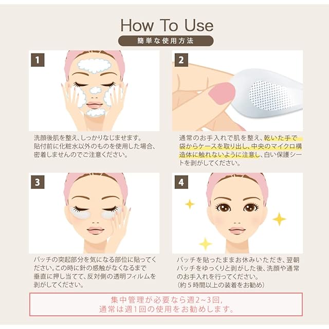✅ 【 使用方法 】 1:洗顔後、肌を整え、しっかりなじませます。 2:通常のお手入れで肌を整え、乾いた手で袋からケースを取り出し、乾いた手で中央のマイクロ構造体に触れないように注意し白い保護シートを剥がしてください。 3:パッチの突起部分を気になる部位に貼ってください。この時に針の感触がなくなるまで垂直に押し当てて、反対側の透明フィルムを剥がしてください。 4パッチを貼ったままお休みいただき、翌朝パッチをゆっくりと剥がした後洗顔や通常のお手入れを行ってください。 (約5時間以上の装着をお勧め)集中管理が必要なら週2~3回,通常は週1回の使用をお勧めします。