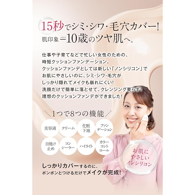 内容量:11g 使用方法 洗顔後、化粧水や乳液、ジェルなどで肌を整えた後にお使いください。 1,専用パフを使い、スポンジ部分を押し当てて適量をとります。 2,お顔にトントンと軽く押し当てるようにつけ、全体になじませます。 3,気になる箇所にはトントンと重ねづけします。 4,小鼻など、崩れやすいところは、パフの使用していないところで軽く抑えるとより密着度が高まります。 パフが汚れたら、中性洗剤を薄く溶かしたぬるま湯で軽く押し洗いをし、よくすすいだ後、タオルなどで水気を取って陰干ししてください。