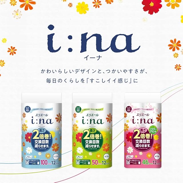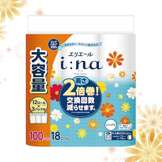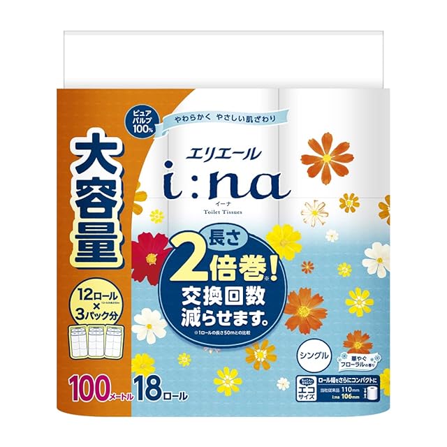 エリエール トイレットペーパー i:na(イーナ) 2倍巻き 100m×18ロール シングル パルプ100% 華やぐフローラルの香り
