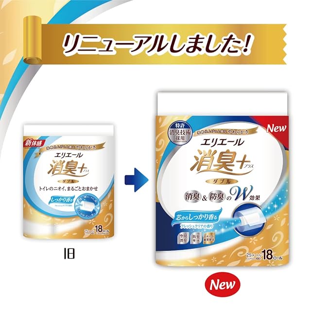 エリエール トイレットペーパー 消臭プラス(+) 25m×72ロール (18ロール×4パック) ダブル パルプ100% 芯からしっかり香るフレッシュクリアの香り【ケース販売】
