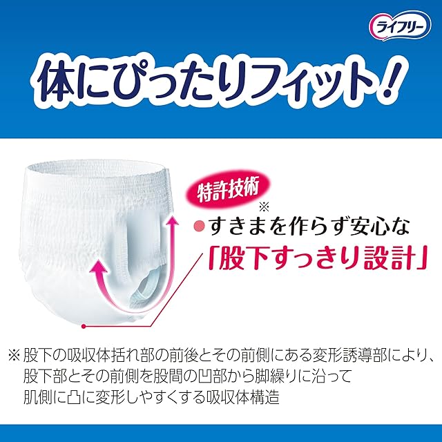 特許技術 ご本人でも破りやすい「らくらくステッチ」*1。両脇を破って、サッと脱げる。*1 係止部の剥離強度が製品横方向に比べて縦方向が弱い、サイドシール構造